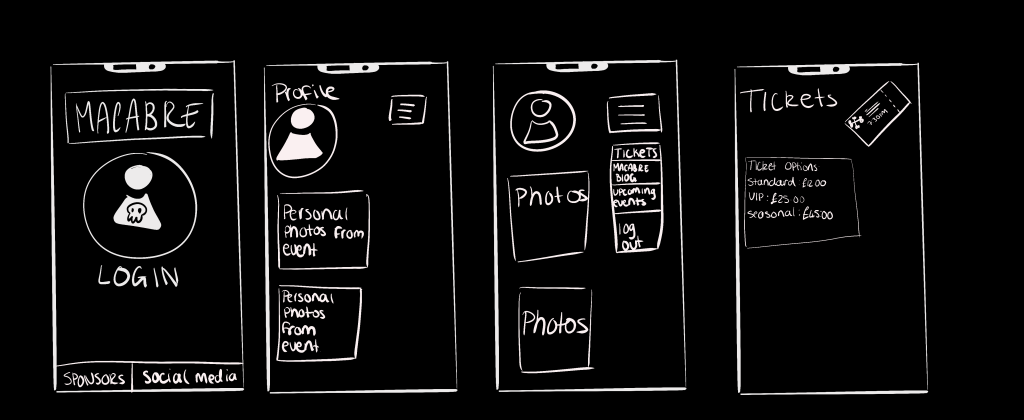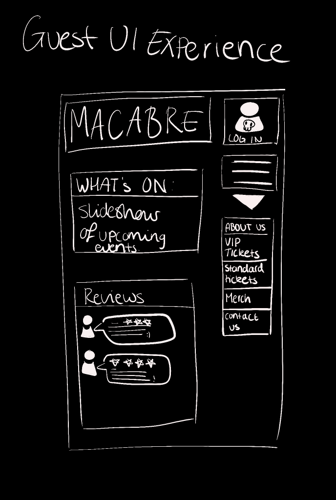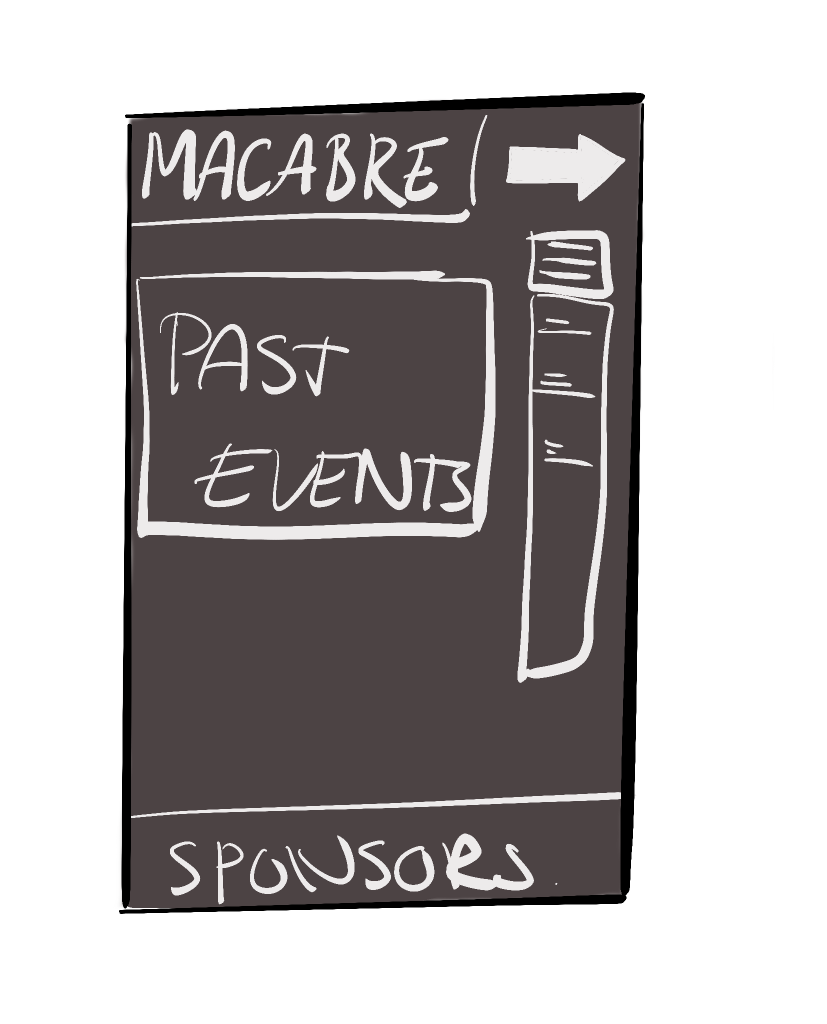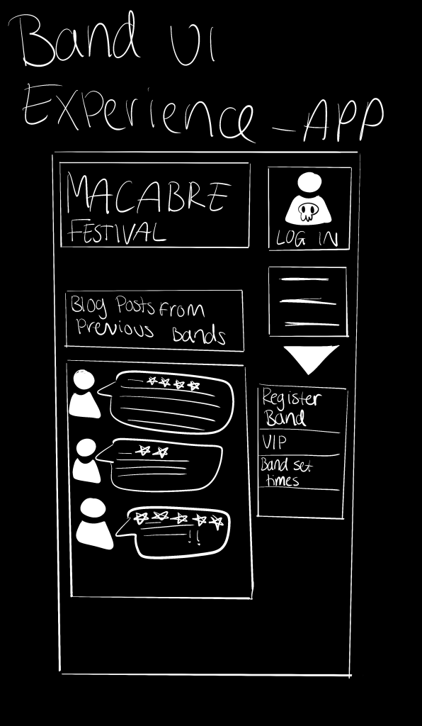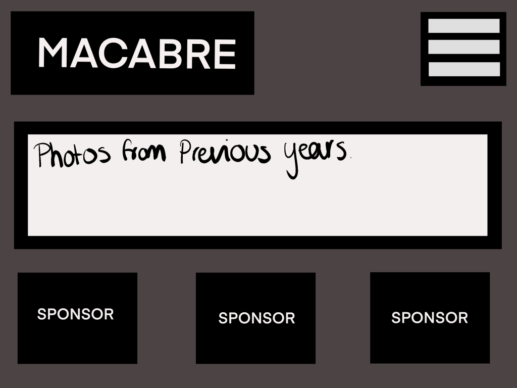 Above is a very simplistic design for ”MACABRE FESTIVAL”, it did not make the final design due to it being very basic, there is no clear usability, it would possibly require the user to have somewhat extended knowledge on how interfaces work. There has been no clear thought process gone into this design, that is visible through the simple boxes and text. The colour palette used, has no contrast other than the white, the background colour is extremely dull with this in mind it would make the experience, uninteresting, this design would not hold an individuals interest. The design may become frustrating for someone who has little to no previous interface experience. There should be clearer indications on what each part does, a user should be able to look at an interface and know straight away what each component should do. For example, a login icon, usually is very prominent on a user interface, therefore, a user will be able to achieve their desired goal more effectively and quickly.
