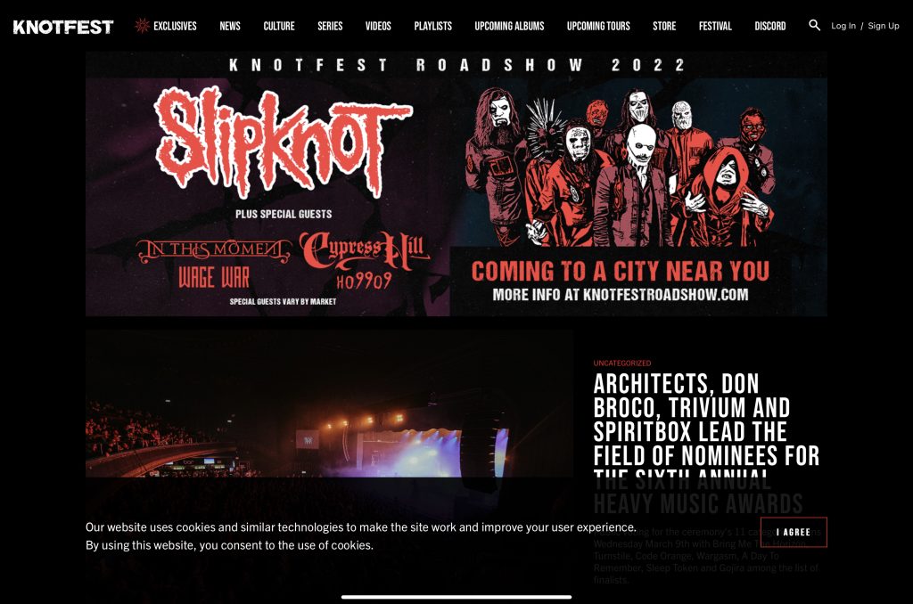 The website above is for a popular metal festival held at numerous places around the world. The hierarchy is set up differently to other websites, there does not seem to be a primary group, rather everything that would normally be in the secondary group, is located in the navigation bar. The layout itself is simple, there is only one font being used (apart from band logos). The colour pallet used is simple as well as aesthetically pleasing, as it matches the theme of the festival.